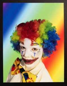The photo is of a clown looking up at the viewer in a three-quarter profile. It is wearing a light yellow shirt and has curly, colourful hair striped in red, yellow, green and blue. The face is painted white with a smiling red mouth, coloured eyebrows and triangular shapes underneath the eyes. Laugh lines are painted on around the eyes and from the nostrils to the corners of the mouth.
