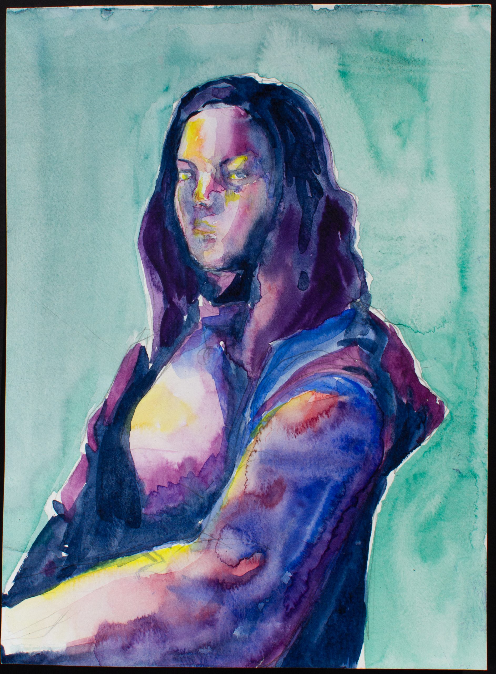 The watercolour painting shows a self-portrait in a three-quarter-view with the right side of the body visible, and the woman looking towards the viewer. The wrist closer to the viewer seems to be resting on a table.