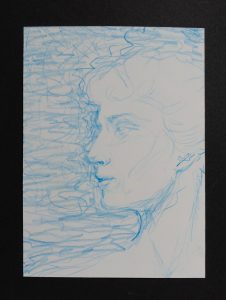 The drawing shows the profile of a woman facing left. The subject is outlined with a mixture of lines, and scribbles fill the entire background, getting denser as they near the edges of her face.