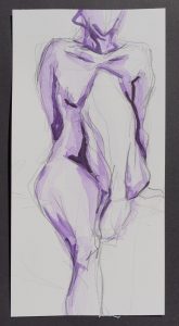 The image depicts a pose of the woman sitting on the stool. She has one leg reaching out of the frame onto the floor while the other is bent, allowing the heel of her foot to rest on the stool. She is holding her arms behind her back, assisting her balance while emphasising the curves and flow of her body.