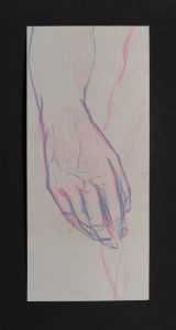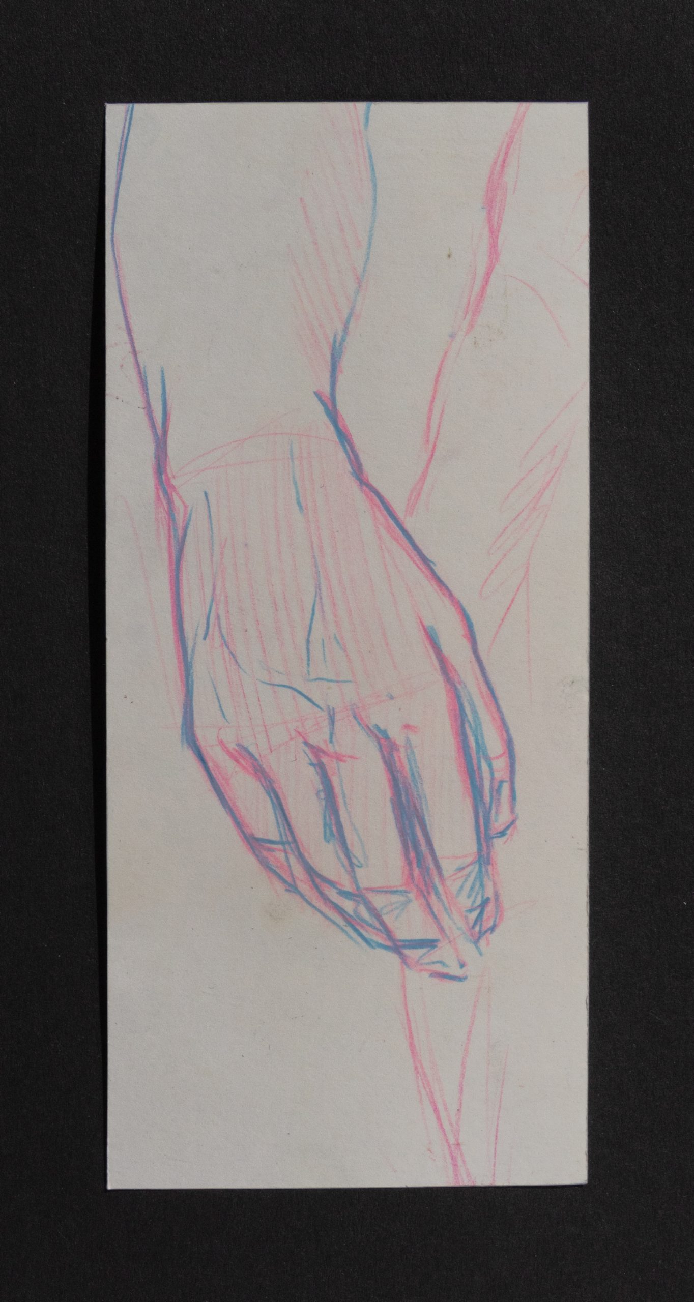 Pale red and blue outlines create an organic feeling of the hand. This effect is amplified through the shadows which are filled in with light stripes of the same red pencil, while the highlights – as in the rest of the sketches – are left paperwhite. The veins are suggested by thin blue outlines.