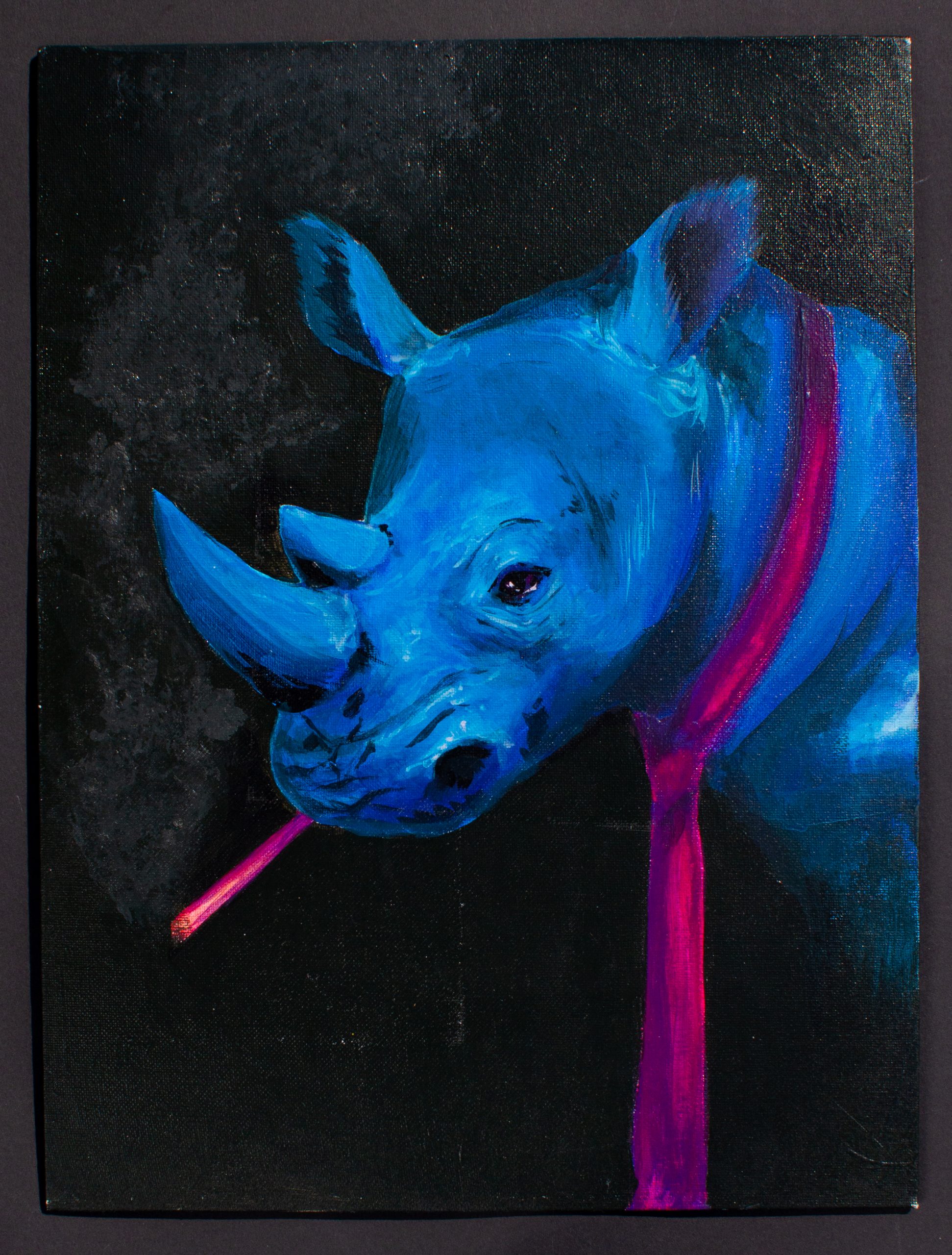 The painting shows a headshot of a blue rhinoceros in a three-quarter-view. He has a hazy, empty look in his eyes and is placed in front of a black background. He is smoking a cigarette, which fills the background to the left of his head with light smoke. The rhinoceros is also wearing a tie, which, together with the cigarette, stands in a complementary contrast to the vibrant blue hide and horns through their bright magenta shade. The rhinoceros is shaded in a rough, blotchy style with stark black shadows and bright, selective highlights which elevate it from the black of the background.