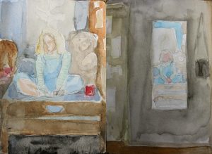 Both sketches are drawn with pencil and coloured with aquarelle paint. The image on the left has mostly soft shades of blue, which contrasts with the warm tones of the chair with the water bottle, the bed frame, red mug and wall, pulling in the focus to the middle of the image where the figure is placed. The second page has the mirror’s surroundings painted with muddy, dark colours. Only the mirror’s reflection is painted in light pastel tones, setting it apart from the surrounding room.