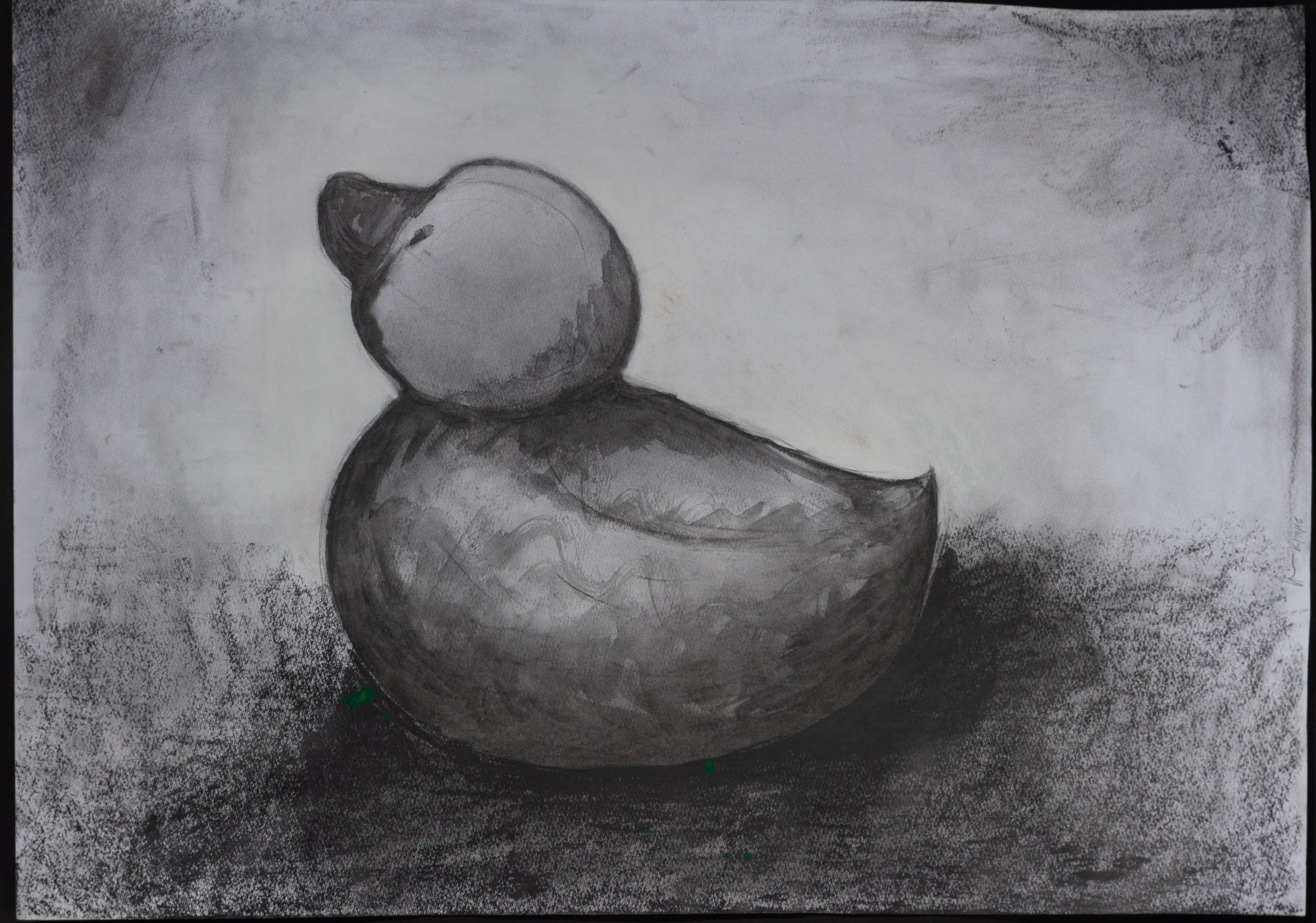 I mixed the graphite powder with water to create a paint mixture and used this as well as the loose powder to create shadows and surfaces. The gloomy mood of the drawing is emphasized by the duck’s lost profile and an imprecise vignette.